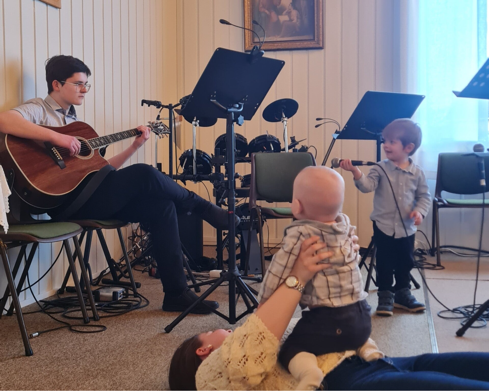 På gudstjenesten hadde jeg musikktjeneste, og jeg fikk med meg Dorthea til å lede lovsangen. Bernhard var også med og spilte gitar på én sang. De fikk ikke forespørselen før på lørdag, så jeg synes de var utrolig sporty som ble med på så kort varsel. (Én av lovsangene vi sang, skrev jeg teksten til på tirsdag. Den kan du lese om her.)
